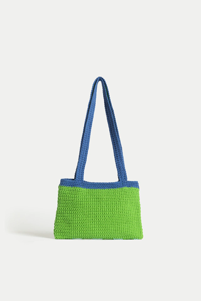 Bolsito tejido a mano en hilo de algodón. Va todo forrado en lona de algodón color verde.