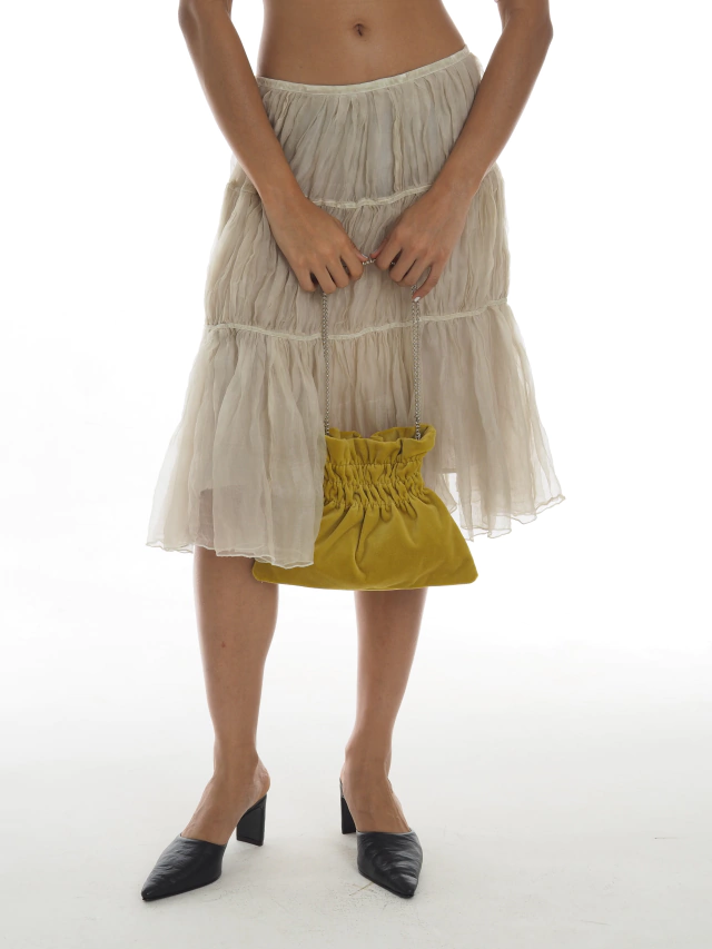Cartera de pana de algodón. En la parte superior tiene un cloqué que frunce la tela y la elastiza.