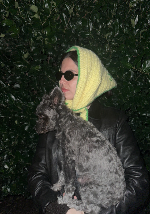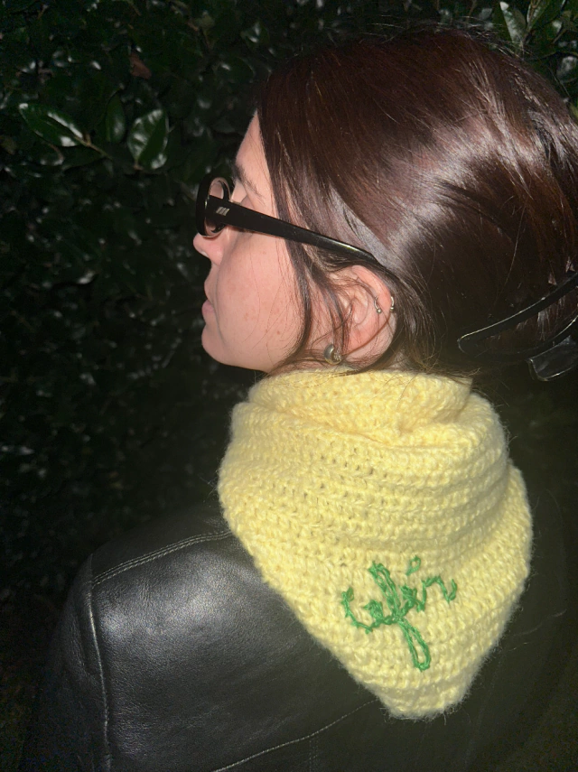 Pañuelo tejido en mohair, con el logo bordado a mano. Pieza ligera, para el cuello o el pelo.
